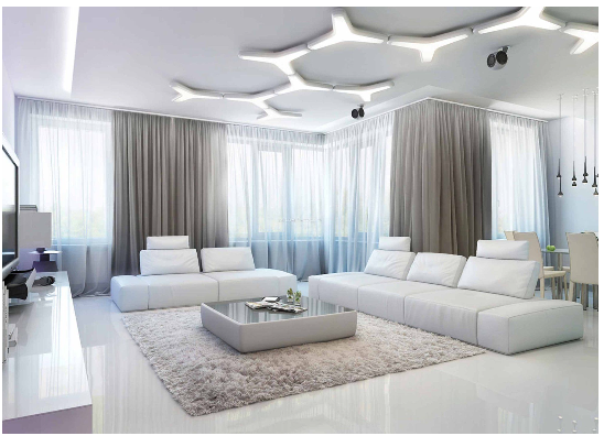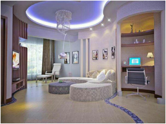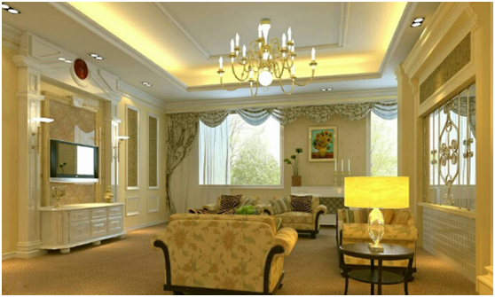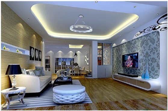 1、四周吊顶,中间不吊。此种吊顶可用木材夹板成型,设计成各种形状,再配以射灯和筒灯,在不吊顶的中间部分配上较新颖的吸顶灯,会使人觉得房间空间增高了,尤其是面积较大的客厅,效果会更好。