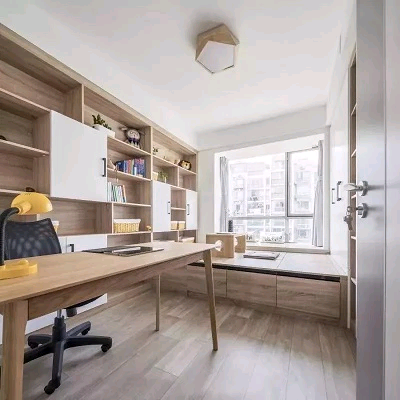 对于面积更大的书房,也可以把书桌居中布置,为主人提供一个更加宽松舒适的空间。在里侧装个榻榻米,休闲书房更惬意。多摆几个书桌椅,可以让多人同时使用。