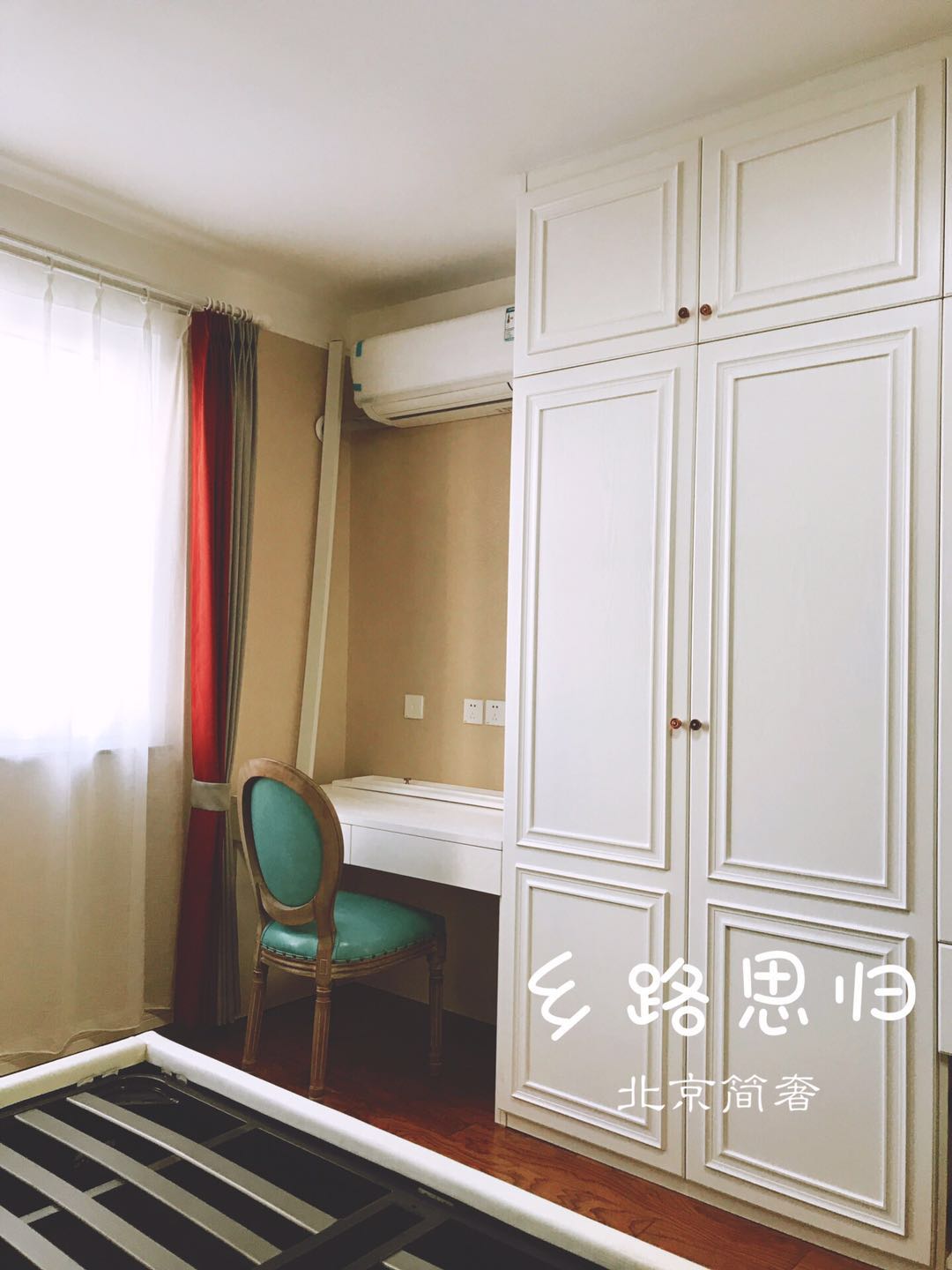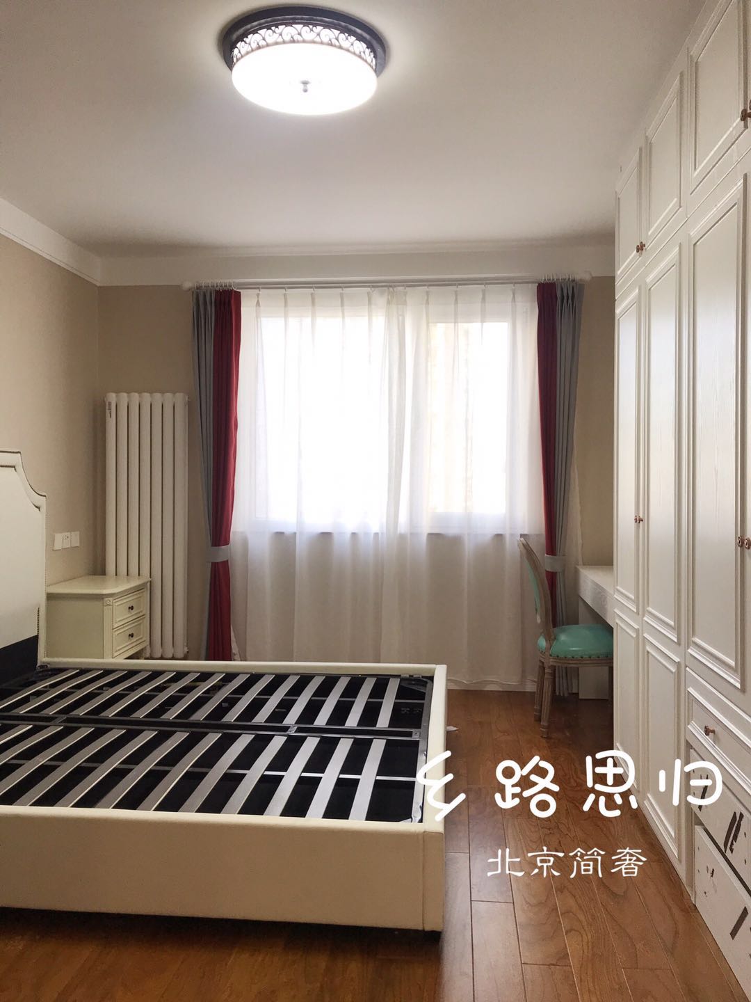 主人卧室更多凸显功能性,进门1.8米的大床,对面是一大面衣柜,靠窗位置是梳妆台。