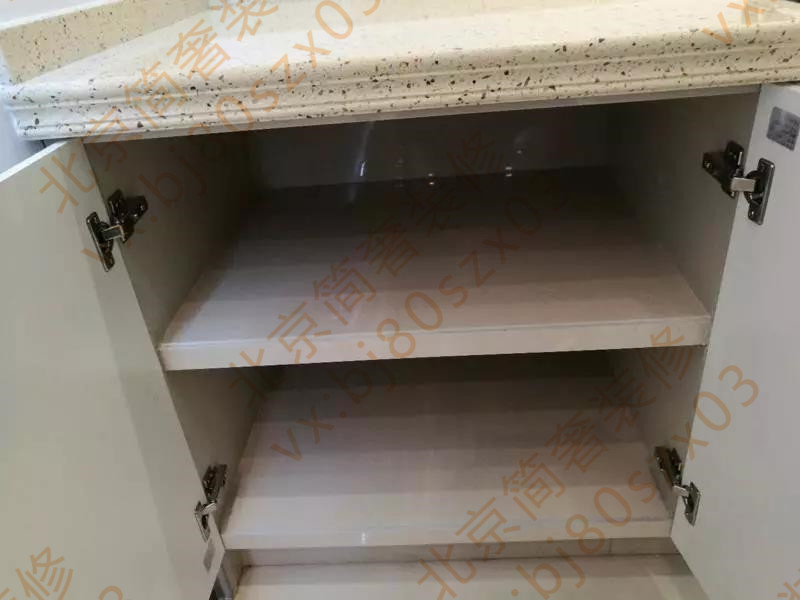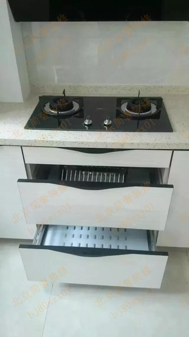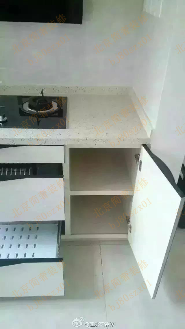 1.整体定制板材橱柜,一般是石英石台面,好打理,内部板材不好打理;