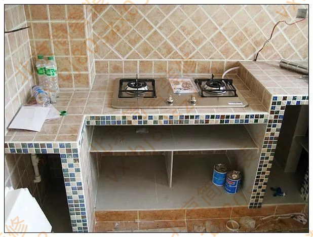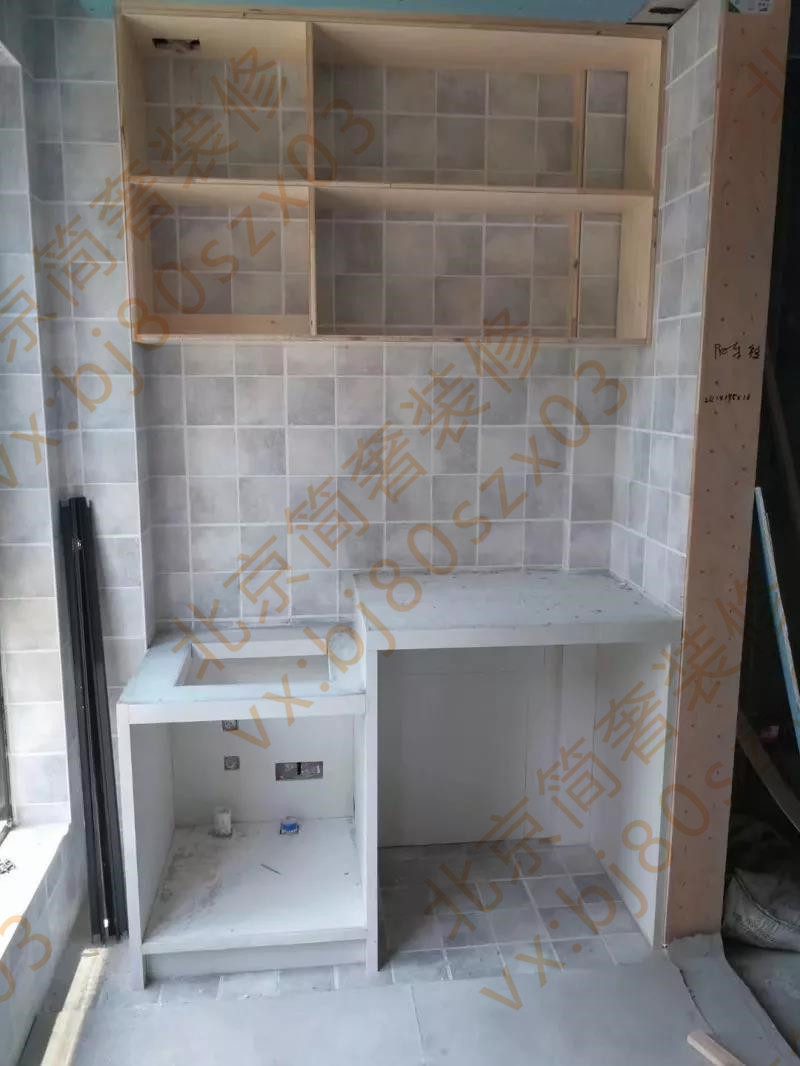3.简奢装修现场制作砖夹橱柜,全瓷砖搭建,材质就是瓷砖了。
